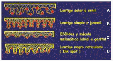 El lentigo solar o senil es una lesión epitelial en la que se observa una hiperplasia epidérmica de tipo lentiginoso; los queratinocitos son de mayor tamaño que el habitual, la hiperpigmentación es homogénea a lo largo de la capa basal de la epidermis, y el número de los melanocitos es normal, aunque pueden estar aumentados de tamaño.