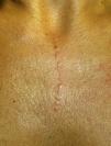 Paciente de 32 años que consulta por una lesión asintomática centro-esternal, recuerda haber notado sin modificación en la forma o tamaño, desde los 20 años. Está preocupada por el efecto estético de la lesión, ya que remedaba una cicatriz quirúrgica de una esternotomía. Como antecedente de interés, presenta una escoliosis que había requerido ser tratada con corsé durante la infancia, pero niega cualquier otra sintomatología.