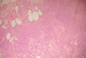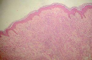 Se realizó la extirpación completa de la lesión y se procedió a su posterior estudio histológico, en el que se apreciaba una lesión compuesta de células melanocíticas pleomorfas en dermis que profundizaba hasta tejido celular subcutáneo con un borde romo bien definido (fig. 2). La lesión estaba constituida por células epitelioides y fusiformes que disecaban las fibras de tejido conjuntivo, rodeaban los tallos pilosos e infiltraban las glándulas ecrinas y el tejido graso (fig. 3). No se identificaron atipias ni mitosis. Con técnicas de inmunohistoquímica las células eran S 100 y Melan A positivas y HMB 45 negativas.