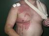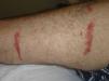 En las lesiones ocasionadas en la intervención quirúrgica o en el postoperatorio inmediato, los primeros datos que debemos valorar son la localización de las lesiones, la morfología de estas y su presencia, o ausencia, en la cicatriz quirúrgica. La localización en áreas declives y las imágenes en chorreras sugieren la intervención de un líquido (fig. 1). Una morfología anular o cuadrada puede implicar a los terminales de control electrocardiográfico o del bisturí eléctrico (fig. 2). La afectación de la zona de incisión quirúrgica se origina en los antisépticos y apósitos empleados antes, durante o inmediatamente después de la intervención