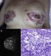 La RMN con contraste mostraba la presencia de numerosas lesiones en forma de nódulos, lesiones filiformes y lesiones laminares de diferentes tamaños ocupando la totalidad de ambas mamas e infiltrando adicionalmente las axilas y la pared torácica (fig. 1 b).