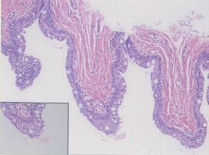 El estudio histopatológico de una de las lesiones evidenció la presencia de una cavidad quística unilocular, localizada en la dermis profunda, sin conexión epidérmica. El epitelio de revestimiento de la cavidad estaba formado por una doble capa celular. Presentaba en algunas zonas distintos patrones de diferenciación, que se observaban en continuidad unos de otros (figs. 2 y 3).