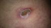 At presentation, symmetrical, bilateral erythematous-violaceous patches were observed on his ears (Fig. 1) and on the lateral walls of the abdomen (Fig. 2). Over the following days, the lesions became infiltrated edematous papules and plaques that subsequently progressed to ulcerated necrotic plaques with an erythematous halo.