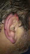 Case descriptionA 47-year-old man with no medical background of note attended the dermatology department for a 1-month history of painful skin lesions on both ears. He otherwise felt well. On further questioning, he denied having taken any new or different prescription drugs and reported no prodromal symptoms. However, he did state he was a smoker and a user of cocaine since the age of 25 years; of note, he had sniffed cocaine 3 days before the onset of the lesions.