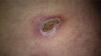 At presentation, symmetrical, bilateral erythematous-violaceous patches were observed on his ears (Fig. 1) and on the lateral walls of the abdomen (Fig. 2). Over the following days, the lesions became infiltrated edematous papules and plaques that subsequently progressed to ulcerated necrotic plaques with an erythematous halo.