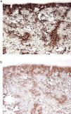 Aproximadamente el 25% de los linfomas cutáneos primarios son linfomas B, pero debido a las controversias en la clasificación de los linfomas cutáneos de células B (LCCB), la verdadera incidencia de los LZM cutáneos es desconocida3,4. Para algunos autores son los LCCB más frecuentes, mientras que para otros son relativamente raros. Debido a las diferencias en el comportamiento y en el pronóstico en los diversos tipos de LZM es importante determinar cuando una infiltración cutánea por LZM es primaria o secundaria. Por definición un linfoma se considera cutáneo primario si en el momento del diagnóstico y durante su estudio de extensión no se encuentra afectación en ningún otro órgano. Así pues, en el presente caso estaríamos ante un LZM en el que se ha demostrado afectación multiorgánica (piel, sangre periférica, médula ósea y bazo). Dichas características son encuadrables en los LZM esplénicos, que cursan de forma indolente y presentan esplenomegalia (casi en el 100%), junto a afectación de la médula ósea (95%) y de la sangre periférica (75%)5. En ocasiones se asocia a enfermedades atoinmunes, pudiendo ser la forma inicial de presentación, lo que no sucedió en este paciente en ningún momento de la evolución. En nuestro caso todas las zonas afectadas presentaban la misma morfología y el mismo inmunofenotipo, lo que sugiere que su origen estaría en un mismo clon. Además, la evolución clínica, con práctica desaparición inicial de las lesiones cutáneas y normalización de la citopenia tras la esplenectomia hablan a favor de un linfoma esplénico con afectación secundaria de la piel. La afectación cutánea por un LZM esplénico es excepcional, ya que se han descrito solo de forma aislada6,7.Chiang et al describen un paciente con múltiples pápulas en tronco y muslos, cuya histología mostró un LZM que simulaba una micosis fungoide6. El estudio de extensión demostró afectación de médula ósea y esplenomegalia, aunque no se realizó estudio histopatológico del bazo. El paciente respondió favorablemente a fototerapia UVB de banda estrecha. En el otro trabajo, Mollejo et al, en su serie de 85 LZM esplénicos, diferencian 4 casos con un patrón difuso de infiltración, IgD negativa, 2 de los cuales presentaban afectación cutánea con epidermotropismo7. Los autores consideran dichos linfomas como una variante del LZM esplénico. No hacen referencia a la intensidad de la afectación cutánea, por lo que no sabemos si era tan florida como en este paciente. No obstante, comparte algunas similitudes con nuestro caso, como la intensa afectación de la pulpa roja en el bazo, la negatividad de IgD (el LZM esplénico suele expresar IgD) y la afectación cutánea con epidermotropismo. Dicho epidermotropismo es algo inusual y no referido en las grandes series de LZM cutáneos primarios8,9, excepto en la serie de Bathelier et al10, donde describen afectación epidérmica en un 8% de los casos. Se trata de 49 casos de LZM, 29 primarios cutáneos y 20 con afectación sistémica, ninguno de ellos esplénico, no se hace referencia a la clínica, ni se especifica si los casos con epidermotropismo corresponden a LZM primarios o secundarios. Además del mencionado trabajo y de los artículos de Chiang y Mollejo (que hacen referencia a una afectación secundaria de la piel por LZM esplénico), solo hemos encontrado publicado un artículo de LZM cutáneo primario con epidermotropismo11.