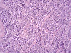 El estudio de extensión (hemograma, VSG, bioquímica, β2-microglobulina, LDH), la TC toracoabdominopélvica y la biopsia de la médula ósea fueron normales. El reordenamiento de las cadenas pesadas de las inmunoglobulinas fue policlonal.