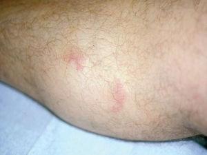 Un varón de 48 años, sin antecedentes personales de interés, consultó por la aparición, desde hacía un año y medio, de lesiones cutáneas localizadas en pierna derecha acompañadas de leve prurito que habían sido tratadas con corticoides potentes tópicos (clobetasol) sin mejoría. A la exploración física se observaron en cara anterointerna de pierna derecha 2 nódulos eritematosos de 1,5 y 1 cm de diámetro respectivamente, mal delimitados, infiltrados al tacto (fig. 4). No se palpaban adenopatías ni visceromegalias.