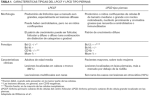 En los últimos años, el intento de dividir los linfomas primarios cutáneos B de células del centro folicular (LPCCF) y los linfomas primarios cutáneos B de célula grande localizados en las piernas (LPCDP) ha sido muy debatido. Sin embargo, la nueva clasificación de la OMS-EORTC de los linfomas cutáneos reconoce los LPCDP como una entidad propia, separada de los LPCCF (tabla 1).