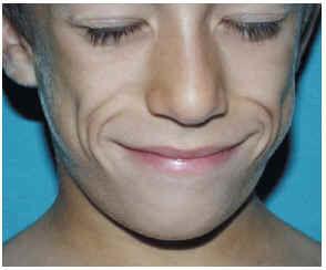 Fig. 1--Pérdida simétrica de la grasa de la cara que le da aspecto envejecido, que es más evidente al sonreír.