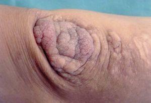 Fig. 1.—Placas papilomatosas queratósicas excrecentes localizadas en codo.