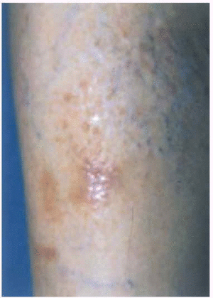 Fig. 1.--Aspecto clínico de placa pretibial de liquen amiloide.