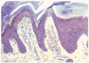 Una biopsia de la lesión cutánea mostró en la tinción con hematoxilina-eosina (fig. 2), un epitelio con una zona de intensa hiperqueratosis, acantosis y papilomatosis con algún cuerpo coloide aislado. En dermis papilar se observaron pequeños depósitos, bien delimitados de una sustancia amorfa, acidófila que daba reacción metacromática con el cristal violeta (fig. 3) y era positiva para rojo Congo (fig. 4). En esa misma zona se observaron incontinencia de pigmento.