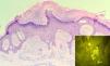 Hiperqueratosis ortoqueratósica compacta, acantosis irregular y depósitos en la dermis papilar que determinan un ensanchamiento de las papilas con desplazamiento lateral de las crestas epidérmicas (hematoxilina-eosina x 100). Recuadro: depósitos de material amiloide en la dermis papilar mostrando fluorescencia verde (tioflavina T x 200).