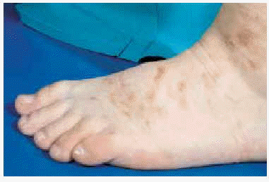 Niña de 12 años que consultó por lesiones asintomáticas de dos meses de evolución localizadas en pierna izquierda. La paciente estaba sana y no había antecedentes personales ni familiares destacables. En la exploración se observaron placas redondeadas, de tamaño variable, de color marrón, con algunas petequias aisladas o en el interior de las zonas pigmentadas, con distribución metamérica a lo largo de L5, en tercio inferior, lateral externo de pierna izquierda y dorso de pie (fig. 3). Los resultados de los estudios hematológicos, bioquímicos y de coagulación fueron normales. El tratamiento con corticosteroides tópicos no fue eficaz. Al año, la pigmentación había disminuido espontáneamente, adquiriendo un tono amarillo dorado (fig. 4).