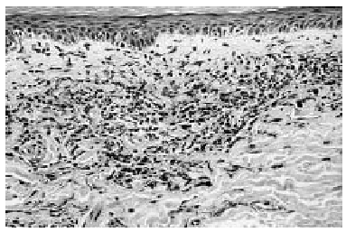 Fig. 5.--Liquen áureo. Visión panorámica de la lesión. Se observa un infiltrado mononuclear en la dermis superficial que respeta la zona más superficial del colágeno.