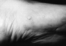FIG. 1.--Aspecto clínico de las lesiones agrupadas en arco plantar con pápulas de diferente morfología.