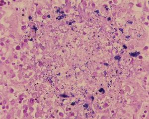 Desde la Unidad de Cuidados Intensivos Neonatales se solicitó la evaluación dermatológica de un niño de 24 h de vida, nacido a las 29 semanas de gestación por cesárea urgente, con una erupción pustulosa congénita. Era fruto de una tercera gestación, sin incidentes destacables, con controles ecográficos y serológicos correctos. Nació con un peso de 1.580 g, Apgar de 3/5/7 y temperatura de 38,7 °C. Además, presentaba disnea e hipotensión. Tenía unas 25-30 pústulas de 1-2 mm de diámetro sobre una base eritematosa, no confluentes, que tendían a agruparse en el abdomen (fig. 1) y respetaban palmas, plantas y cuero cabelludo. En el examen microscópico del raspado de las pústulas mediante la técnica de Tzanck destacaba un infiltrado inflamatorio agudo acompañado de cocobacilos grampositivos mediante la tinción de Gram (fig. 2). En los hemocultivos y en los cultivos de las pústulas se aisló Listeria monocytogenes serotipo 4. La evolución fue satisfactoria con ampicilina intravenosa durante 21 días, asociada inicialmente a gentamicina. Las lesiones cutáneas desaparecieron al tercer día.