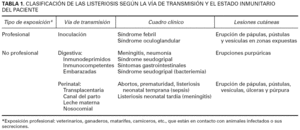 La vía de transmisión más frecuente es la digestiva, a partir de alimentos contaminados 4,6. Tras un período de incubación de 8 a 14 días empiezan los síndromes febriles, síntomas gastrointestinales inespecíficos autolimitados y, de forma excepcional, erupciones purpúricas 4,6,7. Las personas con alteración de la inmunidad celular o edades extremas de la vida son las más susceptibles de padecer infecciones potencialmente graves, en forma de meningitis y con menor frecuencia, neumonías 5,6,8. Se estima que la mitad de los casos de listeriosis están asociados a trastornos subyacentes de la inmunidad celular (pacientes infectados por el virus de inmunodeficiencia humana, afectados de colagenosis o diabetes o tratados con corticoides sistémicos, inmunosupresores o radioterapia).