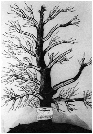 En 1829 publicó, basándose en el esquema de Tori para la clasificación de las «fiebres»3, su famoso «Árbol de las dermatosis»5 comparando la clasificación de las enfermedades cutáneas y las diferentes partes de un árbol (fig. 2). El tronco sería la piel, de él salían doce ramas grandes que correspondían a las enfermedades cutáneas más específicas y de ellas emergían unas ramas más pequeñas que representarían las diferentes variantes de las anteriores2. Los doce grupos de enfermedades de la piel que consideró fueron: eccematosas, exantemáticas, tiñosas, dartrosas, cancerosas, leprosas, verolosas, estrumosas, escabiosas, hematosas, discromatosas y heteromorfas. Si tenemos en cuenta que los criterios utilizados por Alibert para establecer estas «familias» fueron variables, no nos llamará la atención un resultado final tan discordante, agrupando enfermedades muy diferentes entre sí. Como consecuencia de esta falta de base, la clasificación de Alibert tuvo pocos seguidores, pasando al olvido pocos años tras la muerte de su autor5.