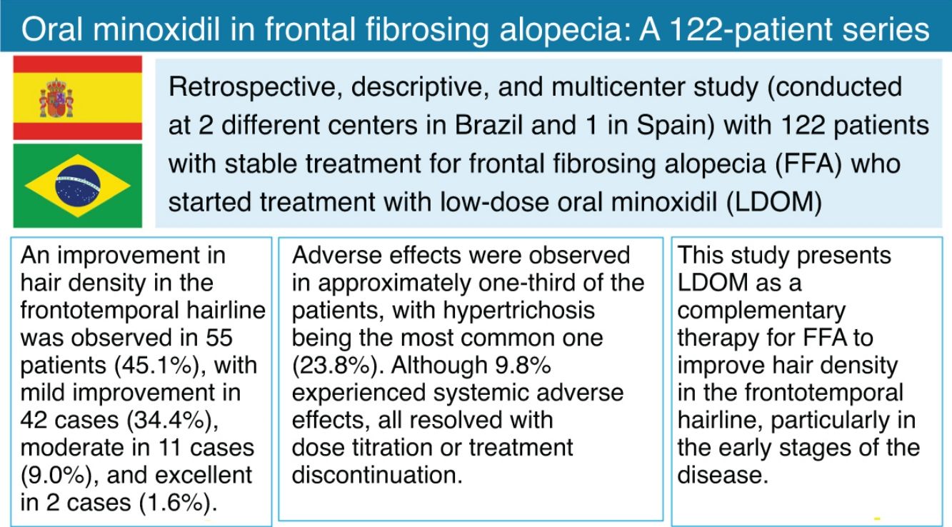 In recent years, low-dose oral minoxidil (LDOM) has garnered significant attention for the treatment of various types of alopecia due to its potential to stimulate hair follicle growth with a favorable safety profile,1 even in cicatricial alopecias.2 Regarding frontal fibrosing alopecia (FFA), numerous studies have reported the utility of topical minoxidil as an adjuvant therapy for these patients.3,4 Moreover, it was recently published that LDOM might improve eyebrows in FFA,5 although its effect on the frontotemporal hairline has not yet been studied. However, it has been suggested as an adjuvant treatment in therapeutic algorithms to improve overall hair growth.6 For this reason, the primary endpoint of our study was to analyze the effectiveness of LDOM on the frontotemporal hairline in FFA, considering eyebrows, eyelashes, and general hair growth as secondary endpoints.
