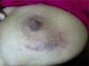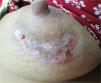 A 28-year-old female presented with a slightly painful, raised reddish lesion that had developed in her left breast over the previous 3 months. She gave no history of trauma and did not describe constitutional symptoms. The lesion had increased in size after the repeated application of mud to the area over 2 months. Treatment with a potent topical corticosteroid (betamethasone valerate, 0.122% wt/wt) was then applied twice daily for a month.