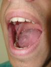 Se efectuó un tratamiento lento y progresivo con el fin de evitar un edema lingual que pudiese comprometer la vía aérea, además de la administración de 20 a 40mg de metilprednisolona intramuscular durante las primeras sesiones. Fue necesaria la infiltración anestésica de la lesión con mepivacaína al 2% previa al tratamiento con láser, excepto en las dos últimas sesiones, que no se precisó anestesia. En las zonas tratadas se pudo objetivar un edema moderado sin datos de compromiso respiratorio, no se presentaron otras reacciones adversas reseñables. Tras 8 meses de finalizar el tratamiento se puede apreciar una marcada disminución del tamaño de la malformación venosa, con una resolución completa en algunas zonas (figs. 2 y 3).