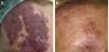 EvaluaciónSe utilizó una escala visual basada en fotografías efectuadas antes de realizar la primera sesión de tratamiento y al menos un mes después de la última. Cuatro dermatólogos evaluaron de manera independiente en una escala del 10 al 0 la efectividad del tratamiento teniendo en cuenta el color, la textura cutánea y la elevación de la lesión; se consideró el valor de «10» como el original previo al tratamiento y «0» como una piel completamente normal. La media obtenida de las valoraciones de los 4 evaluadores se consideró como el valor de mejoría de cada paciente.