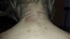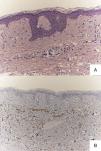 We present the case of a 55-year-old woman diagnosed with lobular breast carcinoma 15 years earlier. The patient was referred to our unit for a 1-year history of lesions that had arisen in the cervical region and that had extended to the upper third of the back and chest. Physical examination revealed hard, well-defined, edematous, erythematous papules and plaques in the posterior cervical region (Fig. 1), and localized erythema of all 4 eyelids that infiltrated to the deeper planes and interfered with eye opening (Fig. 2A) and closure (Fig. 2B).