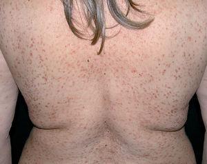 Desde el punto de vista dermatológico, la edad de comienzo de las lesiones cutáneas variaba entre 20 y 75 años, con una edad media de presentación de 39,83 años. Las lesiones cutáneas en todos los pacientes eran bastante similares, variando únicamente en su número y distribución (figs. 1 y 2). Todos los pacientes presentaban máculas y pápulas de coloración marrón o parduscas y en algunas de ellas se observaban finas telangiectasias superficiales. El signo de Darier era positivo en los primeros 2 casos y negativo en el resto de los pacientes. Las lesiones se distribuían por el tronco y extremidades, con una distribución centrípeta y mayor intensidad en el tronco. En uno de los pacientes existía afectación de la cara. Las palmas y las plantas estaban respetadas en todos los casos.