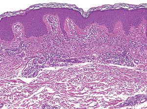 Fig. 3.--Detalle del infiltrado de disposición liquenoide. Obsérvese la ausencia de epidermotropismo. (Hematoxilina-eosina, x40.)