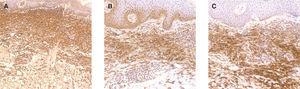 Fig. 4.--Características inmunohistoquímicas del infiltrado del paciente 7. La mayoría de las células del infiltrado expresan vimentina (A), CD 117 (B) y CD 68 (C).