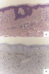 Presentamos el caso de una mujer de 55 años de edad, diagnosticada de carcinoma lobulillar de mama de 15 años de evolución. Esta fue remitida a nuestra unidad por lesiones de un año de evolución que se habían originado en la región cervical y extendido hacia el tercio superior de espalda y tórax. En la exploración clínica, presentaba pápulas y placas eritematoedematosas de consistencia dura, bien definidas en la región cervical posterior (fig. 1), así como eritema localizado en los 4 párpados que infiltraba a planos profundos dificultando la apertura (fig. 2a) y cierre (fig. 2b) de la hendidura palpebral.