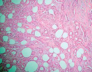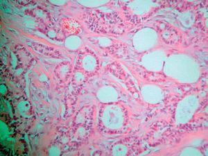 El estudio anatomopatológico de una biopsia realizada en la lesión nodular epigástrica destacó una proliferación celular densa a nivel de la dermis profunda y del tejido celular subcutáneo que respetaba la epidermis y los anejos cutáneos (fig. 2), constituida por células epiteliales dispuestas siguiendo un patrón glandular moderadamente bien diferenciado (fig. 3). Con técnicas de inmunohistoquímica estas células tumorales mostraron una clara positividad para antígeno carcinoembrionario (CEA) (fig. 4) y una negatividad para receptores estrogénicos (fig. 5).