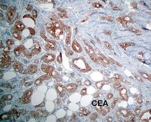 Fig. 4.--Tinciones de inmunohistoquímica que nos ponen de manifiesto una clara positividad para antígeno carcinoembrionario (CEA).