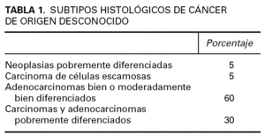 El análisis anatomopatológico tiene una misión fundamental en la evaluación del COD a través de estudios histológicos, inmunohistoquímicos y, siempre y cuando sea apropiado, mediante técnicas de microscopía electrónica. Esta evaluación histológica proporciona una orientación imprescindible para realizar una valoración clínica adecuada del paciente, con el fin de clasificar subgrupos e identificar aquellos individuos para los que hay tratamiento eficaz 2,13. Esto nos permite por un lado una aproximación diagnóstica hacia ciertos tumores concretos como linfomas, melanomas, sarcomas o tumor de células germinales, y por otro lado la agrupación del resto de los pacientes en cuatro categorías histopatológicas (tabla 1) 2,14. Cada grupo presenta características diagnósticas, terapéuticas y pronósticas específicas. Tan sólo en las neoplasias poco diferenciadas es preciso añadir a las técnicas de inmunohistoquímica, la microscopía electrónica y el análisis citogenético.