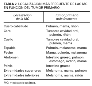 Como sabemos la frecuencia de MC es extremadamente baja, a pesar del gran tamaño de la superficie corporal y de la riqueza de vasos sanguíneos y linfáticos. Las vías de implantación de las células metastásicas en la piel son la linfática, la sanguínea, por contigüidad y la implantación por procedimientos quirúrgicos. Hay diferentes regiones anatómicas que tienen cierta relación como destinos de metástasis que nos pueden orientar en la búsqueda del tumor primario (tabla 2) 17. En cuanto a la semiología, las MC pueden ser nodulares o subcutáneas (pueden simular lesiones benignas como lipomas o quistes cutáneos, o aparecer como lesiones angiomatosas, principalmente en los carcinomas renales, pulmonares y en los coriocarcinomas), esclerodermiformes (la alopecia neoplásica en cuero cabelludo que puede confundirse con la alopecia cicatricial, y el carcinoma en coraza por un carcinoma mamario), inflamatorias y eczematiformes.