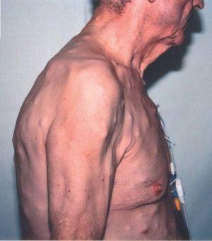 Figura 1. Múltiples nódulos subcutáneos en cuello, partes anterior y posterior del tronco, miembro superior y abdomen.