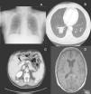 A. Radiografía de tórax antero-posterior en la que se aprecia una radioopacidad mal delimitada a nivel basal derecho. B. TAC torácica que muestra una gran masa de 4,3cm en el lóbulo inferior derecho y otros nódulos pulmonares de menor tamaño. C. TAC abdominal que muestra metástasis intrahepáticas, tanto a nivel perirrenal como adrenal derecho. D. RM cerebral de corte axial en la que se aprecia prominencia del plexo coroideo izquierdo con presencia de imagen de morfología irregular hipercaptante, compatible con lesión metastásica.