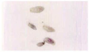 A la exploración se observaban cinco lesiones nodulares inflamatorias, con una zona blanquecina central y discreto edema periférico, localizadas en ambas piernas (fig. 1). No se palpaban adenopatías. Se efectuó expresión mecánica de una de las lesiones obteniendo una larva viva de aproximadamente 1 cm de longitud. Con la ayuda de una pinzas de disección, se extrajeron larvas similares de cada una de las otras lesiones (fig. 2). La larva fue identificada como Cordylobia antropophaga por sus características morfológicas y por su procedencia, y se recomendó tan sólo limpieza de las lesiones con un antiséptico, obteniéndose la resolución de aquéllas en pocos días.
