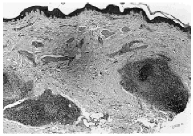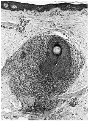 Fig. 2.--Imagen panorámica donde se observa un infiltrado linfoide denso, exclusivamente alrededor de los folículos pilosos (hematoxilina-eosina).
