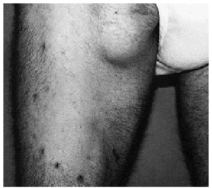 Se trata de un hombre de 33 años, ex adicto a drogas por vía parenteral en tratamiento con metadona, no infectado por el virus de la inmunodeficiencia humana (VIH), infectado por el virus de la hepatitis C (VHC), que fue atendido en nuestra consulta por unas lesiones cutáneas pruriginosas de 10 años de evolución en antebrazo izquierdo y en muslo derecho, junto a una tumoración en ingle derecha de crecimiento progresivo y asintomática. El paciente refería astenia, anorexia y adelgazamiento en los últimos meses.