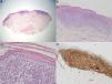 A. Infiltrados linfocíticos focales en la dermis superficial, resto de la dermis e hipodermis libre (H-E × 2). B. Detalle de infiltrado linfocítico bien delimitado en la dermis (H-E ×10). C. Linfocitos atípicos de pequeño y mediano tamaño. Visible epidermotropismo (H-E × 40). D. CD3+ en todo el infiltrado (CD3 ×10).