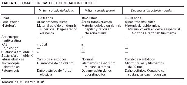 El milium coloide es una degeneración elastótica ligada a un exceso de exposición solar. El origen del depósito de material coloide, que se inicia a nivel de la papila dérmica, no está totalmente dilucidado; parece estar producido por los fibroblastos dañados por la radiación ultravioleta, no siendo únicamente un producto de las fibras elásticas degeneradas como se ha considerado clásicamente2. Como ya hemos mencionado existen tres variedades clínicas que se ven influidas por los siguientes factores etiopatogénicos: