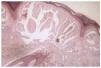 En ambos casos se tomó muestra para examen histopatológico, el cual mostró la existencia de una epidermis atrófica con masas redondeadas, homogéneas y fisuradas de material coloide en dermis papilar, con intensa elastosis solar (fig. 3).