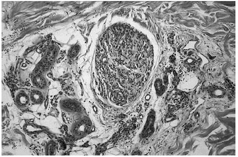 Los hallazgos histopatológicos1, 3 son característicos. Se trata de un tumor localizado en dermis reticular con un patrón bifásico: áreas de apariencia miofibroblástica constituidas por células fusiformes con núcleos alargados de extremos romos que recuerdan fibras musculares lisas, dispuestas habitualmente en haces inmersos en un estroma escleroso; y áreas de apariencia hemangiopericitoide, constituidas por espacios vasculares ramificados rodeados por células de apariencia pericitoide o glomoide, a veces con disposición angiocéntrica. A veces se observa una hendidura en forma de media luna en la periferia de los nódulos.
