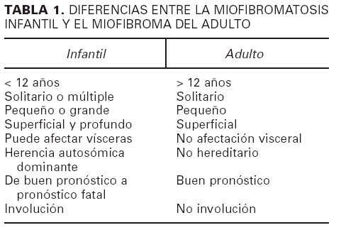 En 1989, Daimaru et al1 describieron específicamente el primer caso de miofibroma cutáneo en un adulto, pero fueron Beham et al3 en 1993 quienes separaron este tipo de lesiones en dos entidades, la infantil y la del adulto, basándose principalmente en su comportamiento biológico distinto. Kutzner et al4 y Requena et al6 publicaron en 1996 la mayor serie de casos de miofibroma cutáneo del adulto y postularon un origen pericitario de la tumoración. Similares conclusiones fueron posteriormente publicadas por Granter et al7. Mentzel et al8 habían propuesto la misma histogénesis en los casos de miofibromatosis infantil 2 años antes.