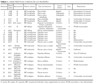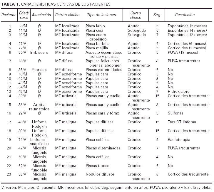 El período de seguimiento estuvo entre 2 y 25 años, con una media de 6,4 años. En 7 casos (30,4%) la mucinosis folicular se asoció a linfoma (mucinosis folicular secundaria), mientras que los 16 casos correspondieron a mucinosis folicular primaria. En la tabla 1 se recogen las características clínicas de los pacientes.