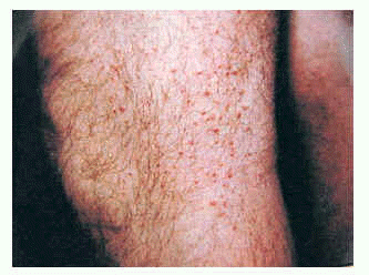 En nuestra serie encontramos tres pacientes (16% del total de formas primarias) con la clínica típica de la forma clásica difusa. Todos ellos varones, con edades entre 18 y 50 años (media: 34,3 años), un caso asociaba enfermedad del suero, una asociación no descrita anteriormente en la literatura. Los pacientes presentaban lesiones múltiples, diseminadas en tronco y extremidades, ocasionalmente con afectación cefálica. Las lesiones consistían en pequeñas pápulas y placas, edematosas, descamativas, con alopecia asociada (fig. 2); en uno de los pacientes las lesiones se encontraban eccematizadas. El curso clínico fue crónico en todos los casos, pese a que dos pacientes respondieron temporalmente al tratamiento con PUVA (psoraleno y luz ultravioleta). Ningún caso evolucionó a linfoma tras un período de seguimiento medio de 6 años.