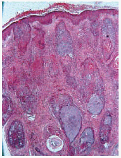Los casos de mucinosis folicular urticarial fueron los más fácilmente identificables histológicamente. Los depósitos de mucina eran escasos; sin embargo, el infiltrado inflamatorio era muy abundante, siendo su localización superficial y profunda (incluso hasta tejido celular subcutáneo). El dato más característico era la gran abundancia de eosinófilos, significativamente superior a la de todas las otras formas clínicas definidas de mucinosis folicular (fig. 8). Los depósitos de mucina eran escasos.